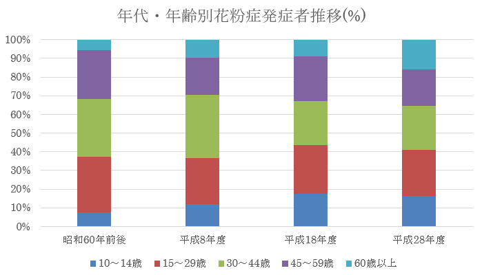 今や国民病と言っても過言ではない、とまで言われる花粉症、全国民の約半数が発症しているといいます。では、どのような年代の方に多く発症しているのでしょうか?