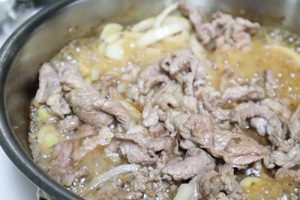 一呼吸おいて香りが立ってきたら、しょうゆ、みりんで味を整えます。